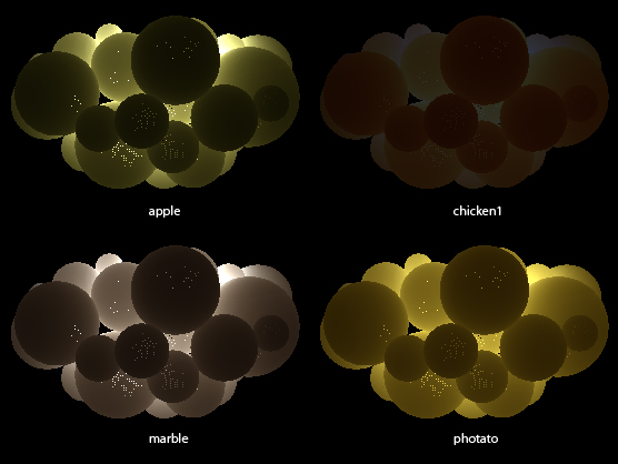 One of interesting things about generating SSS effect in ptfilter is that it has several material presets whose parameter names are “chicken1”, “ketchup” or “cream”. I tried all of thier presets and here are some.